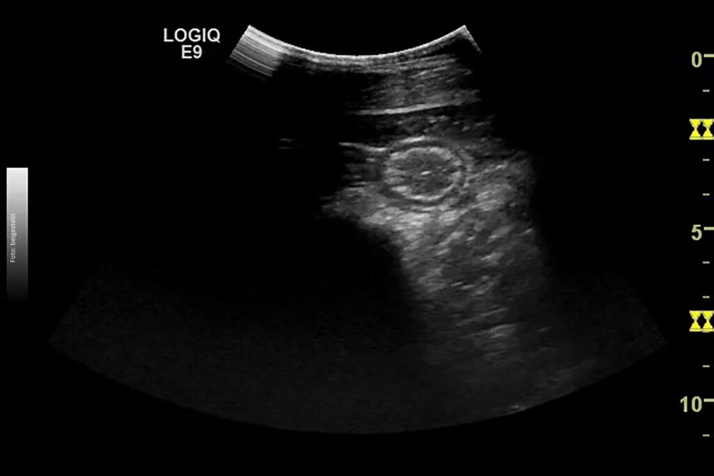 Der nächste Schritt ist ein Abdomenultraschall: Hier ist bei einer IBD eine Verdickung der Darmschleimhaut zu erwarten. Die Dünndarmschleimhaut sollte ja drei bis vier Millimeter dick sein. Ein Wert über 5,7 mm zeigt deutlich an, dass etwas nicht in Ordnung ist. Außerdem achte ich darauf, ob die Veränderungen gleichmäßig verteilt sind oder nur einzelne Darmschlingen stark verdickt sind. Ein weiterer diagnostischer Schritt ist die Abdominozentese: Hier werden das Totalprotein, die Gesamtzellzahl sowie das Laktat gemessen. Dies ist auch wichtig, um ein Lymphom, eine weitere Differentialdiagnose, ausschließen zu können, wobei hier das Bauchhöhlenpunktat auch unverändert sein kann. Bei den meisten Pferden mit IBD ist das Totalprotein nicht verändert.