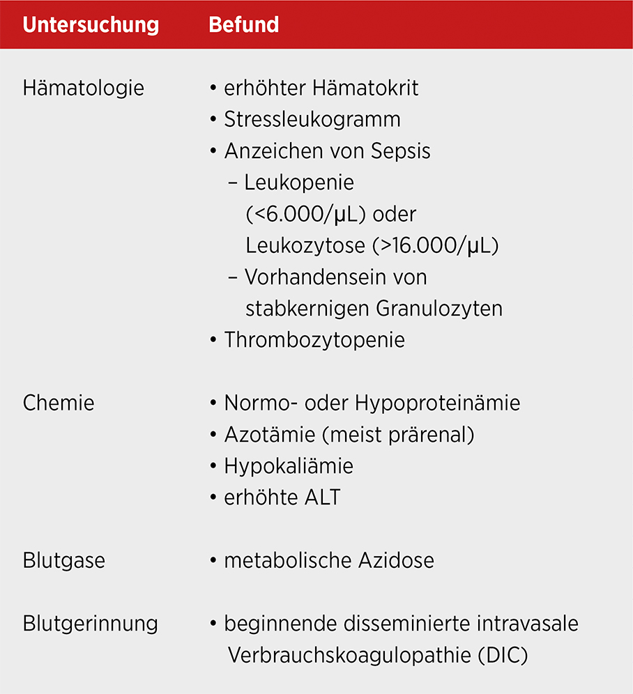 Viele Hunde zeigen einen progressiven Verlauf und die Besitzer geben einen perakuten Beginn an. Klassische Befunde bei der klinischen Untersuchung beinhalten neben Hypothermie und Salivation eine Druckdolenz im cranialen bis mittleren Abdomen (Unterer et al., 2011).