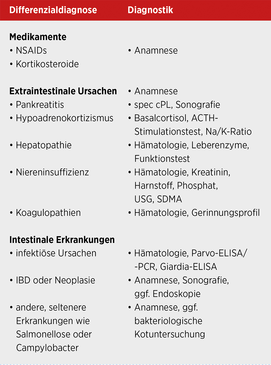 Wie bereits beschrieben handelt es sich bei AHDS stets um eine Ausschlussdiagnose, daher sollte neben einer Blutuntersuchung immer eine Kotuntersuchung (Parvovirose, Parasiten) und eine abdominale Sonografie zum Ausschluss anderer Erkrankungen – wie etwa Pankreatitis – oder eines Fremdkörpers durchgeführt werden (Unterer et al., 2015).