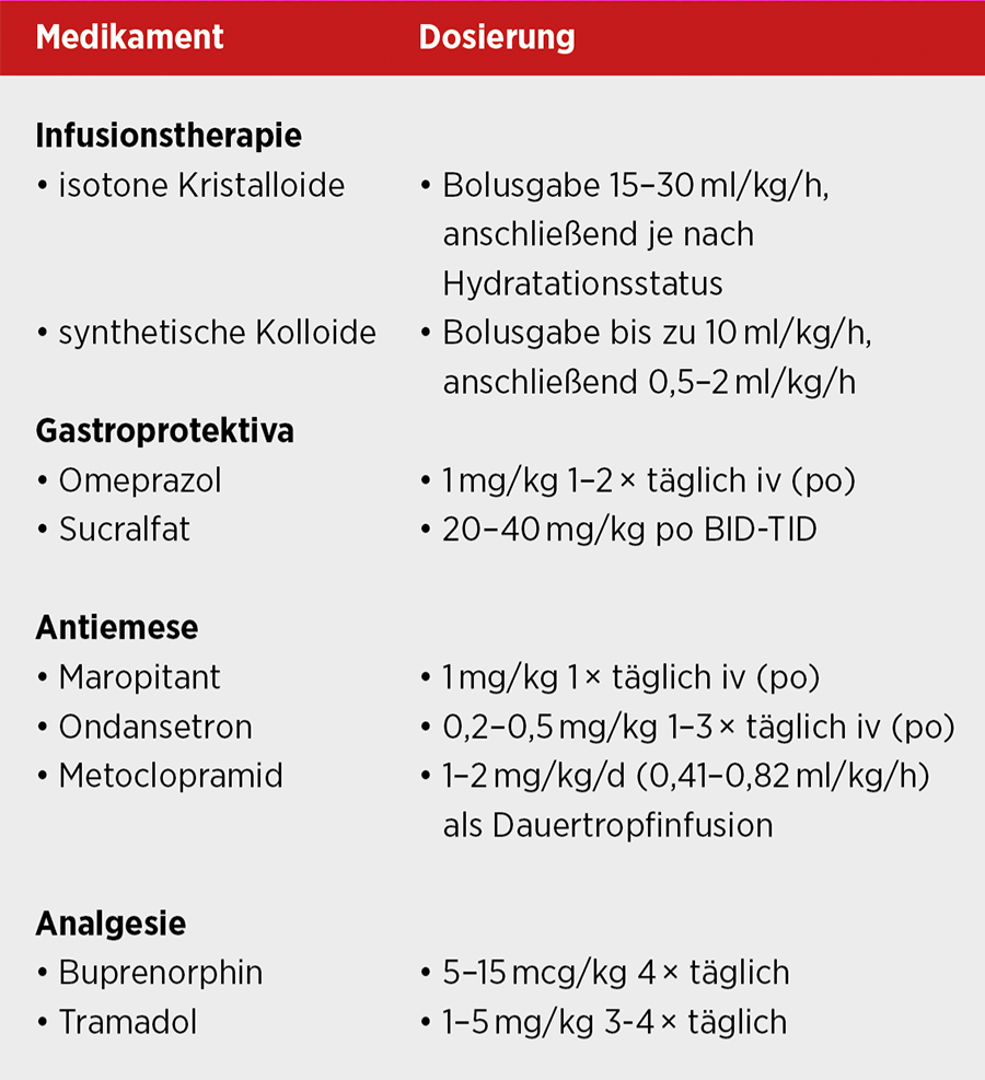 Der Grundpfeiler einer erfolgreichen Therapie ist eine aggressive intravenöse Infusionstherapie mit kristalloiden Lösungen. Initial sollte zur Stabilisierung mit wiederholten Bolusgaben begonnen werden, kolloidale Lösungen wie Voluven („HAES“) oder eine Plasmatransfusion müssen bei komplizierten Verläufen ergänzt werden. Neben gastroprotektiven, antiemetischen und analgetischen Maßnahmen profitieren die Patienten von einer fettarmen und hochverdaulichen Schonkost (Mortier et al., 2015).