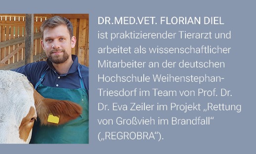 Feuer im Stall ist der Albtraum für jede Landwirtin und jeden Landwirt. Einer Umfrage zufolge bleibt für die Evakuierung der Tiere oft nur eine halbe Stunde Zeit, manchmal sind es gar nur 15 Minuten. Florian Diel ist praktizierender Tierarzt und arbeitet als wissenschaftlicher Mitarbeiter an der deutschen Hochschule Weihenstephan-Triesdorf im Team von Prof. Dr. Dr. Eva Zeiler. In seiner Dissertation beschäftigte er sich mit Evakuierungsstrategien von Rinderherden im Falle eines Stallbrandes unter Berücksichtigung der ethologischen und sinnesphysiologischen Bedürfnisse der Tiere.