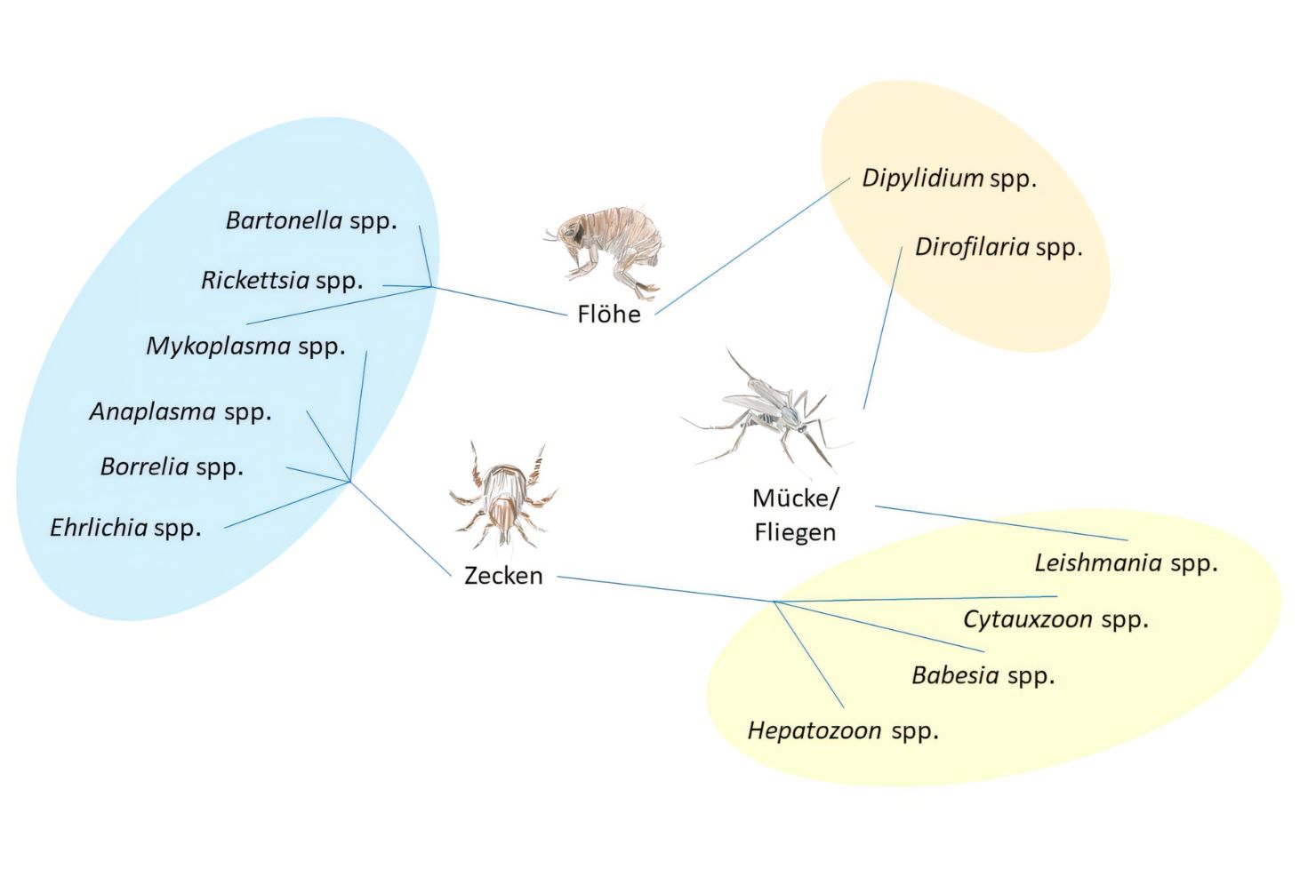 Eine Übersicht über relevante vektorübertragene Infektionserreger bei Hunden und Katzen zeigt Abbildung 2. Für Haustiere in unseren Regionen sind Infektionen mit Babesien und Anaplasmen, die über Zecken übertragen werden, von großer Bedeutung. Einige Erreger können auch direkt von unseren Haustieren auf den Menschen übertragen werden und Krankheiten, z. B. Bartonellose, umgangssprachlich Katzenkratzkrankheit, hervorrufen. In den wärmeren Regionen Europas gibt es weitere Vektoren und damit verbunden somit natürlich auch mehr vektorübertragene Krankheiten.