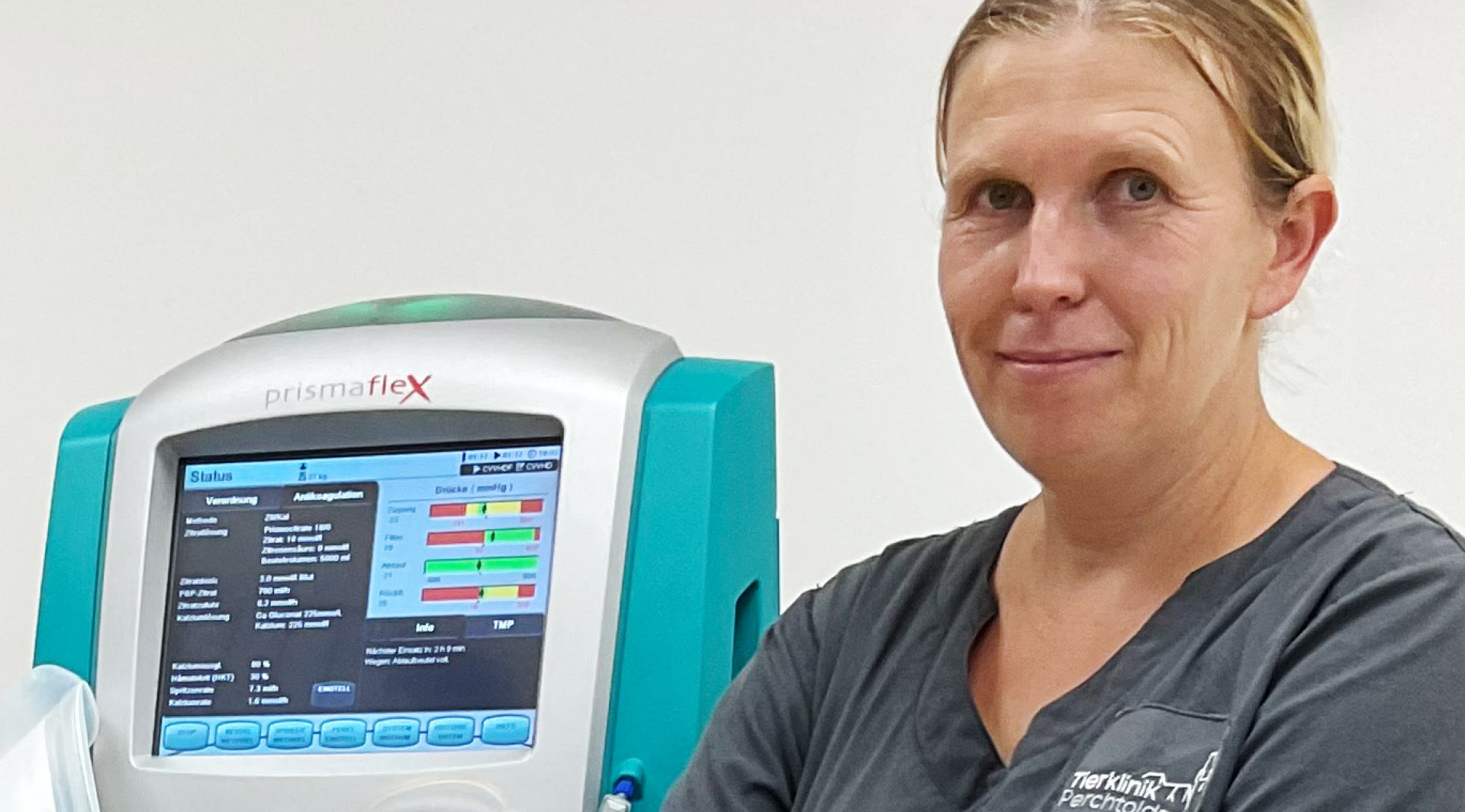 Bei uns werden die Patienten zunächst stationär aufgenommen und, falls noch notwendig, sorgfältig diagnostiziert, um mit dem Besitzer bzw. der Besitzerin eine realistische Prognose besprechen zu können. Dann wird im Rahmen einer Sedierung ein großlumiger Dialysekatheter über die Vena jugularis gesetzt, der mit seiner Spitze im rechten Atrium zu liegen kommt. Nahezu bei allen Patienten wird gleichzeitig eine Ösophagussonde gesetzt, lediglich bei akuten Intoxikationen ist das manchmal nicht notwendig, weil diese Patienten oft noch normal fressen und dank der Dialyse auch wenig klinische Symptome entwickeln. Die Patienten erhalten dann eine Antikoagulation, um die Therapie zu ermöglichen. In aller Regel verwenden wir eine systemische Heparin-Antikoagulation. Bei akuter Blutungsneigung oder bei eventuell notwendigen chirurgischen Eingriffen entscheiden wir uns zu einer lokalen Citratantikoagulation. Wir starten dann die Therapie je nach Indikation als kontinuierliche Therapie oder als intermittierende Therapie (mit Pausen dazwischen). Die Patienten werden kontinuierlich von einer geschulten Person überwacht, eine Sedierung ist in aller Regel nicht notwendig. Auch sehr kleine Tiere können behandelt werden – dann wird das extrakorporale System vorher mit Spenderblut gefüllt, um die Hämodynamik des Patienten nicht zu sehr zu beeinträchtigen.