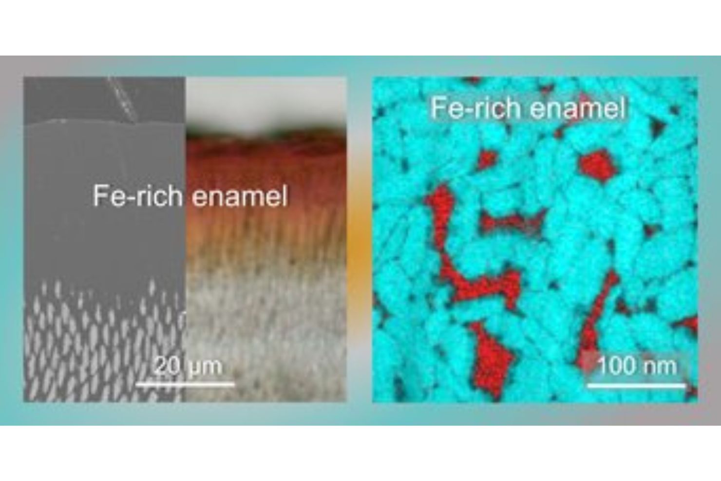 V.li.n.re.: Rasterelektronenmikroskopische Aufnahme des geätzten Querschnitts eines Nagetier-Schneidezahns (links) im Vergleich zur optischen Aufnahme desselben Bereichs (rechts). Letztere zeigt den Effekt, dass die Farbe von der Zahnoberfläche durch den eisenreichen Zahnschmelz (Fe-rich enamel) ins Zahninnere hindurchscheint.