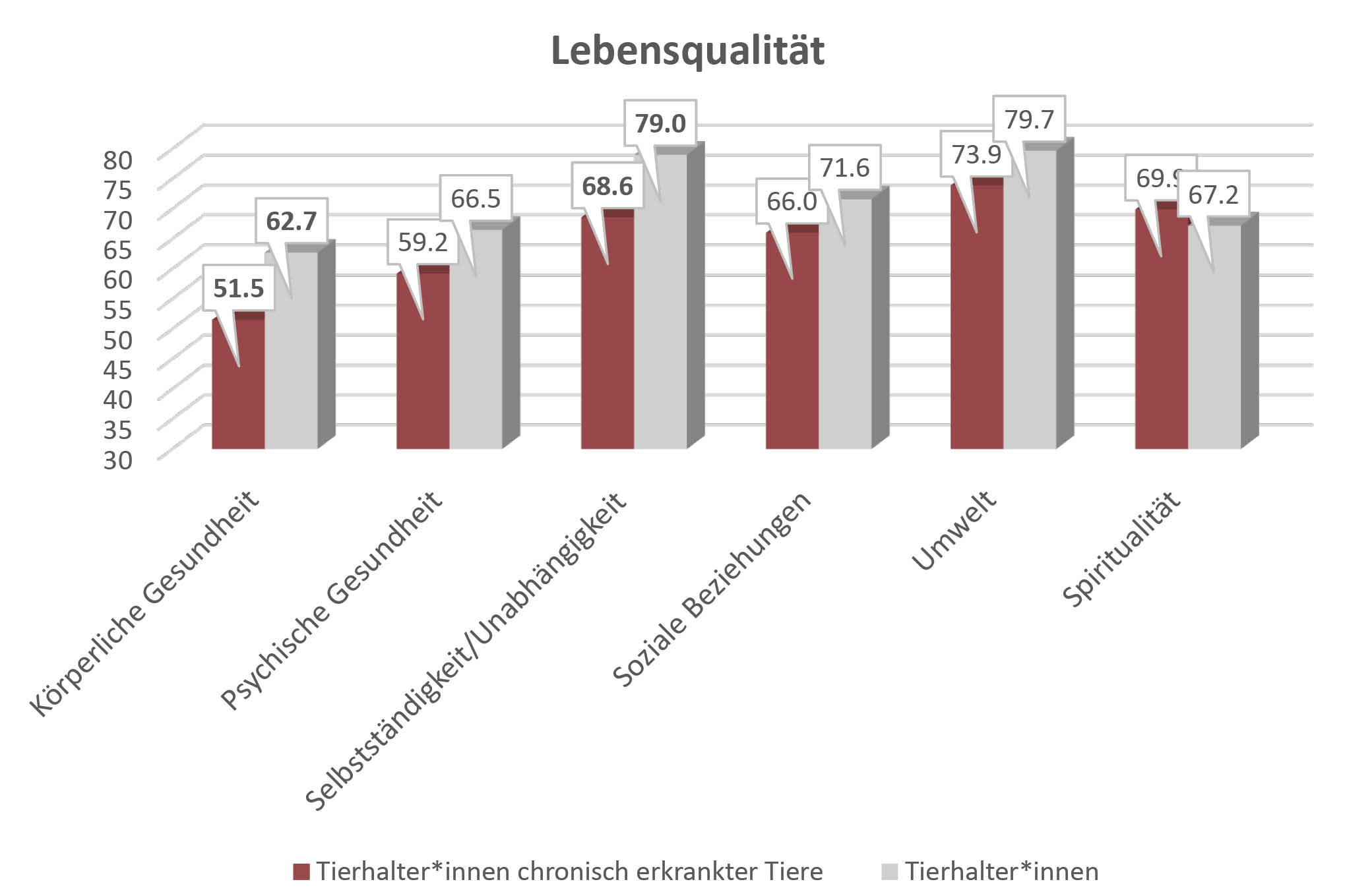 Unterschiede zwischen Tierhalter*innen chronisch erkrankter Tiere und Tierhalter*innen hinsichtlich unterschiedlicher Bereiche der Lebensqualität.