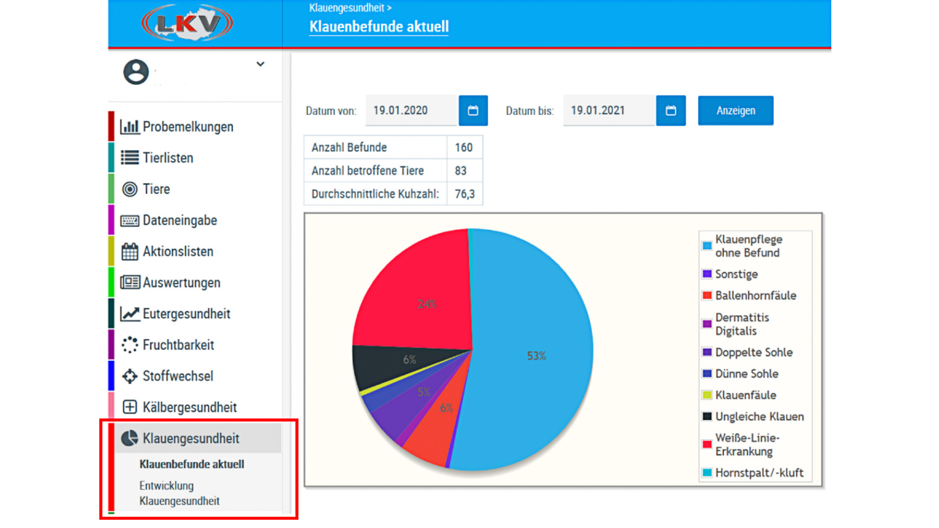Die Ansicht „Klauenbefunde aktuell“ (Abb. 1) gibt einen Überblick über die Klauenbefunde des letzten Jahres auf dem Betrieb. Der Zeitraum der Betrachtung kann beliebig verändert werden. Das dargestellte Tortendiagramm zeigt den Anteil (%) an Klauenbefunden, die im definierten Zeitraum auf dem Betrieb dokumentiert wurden.