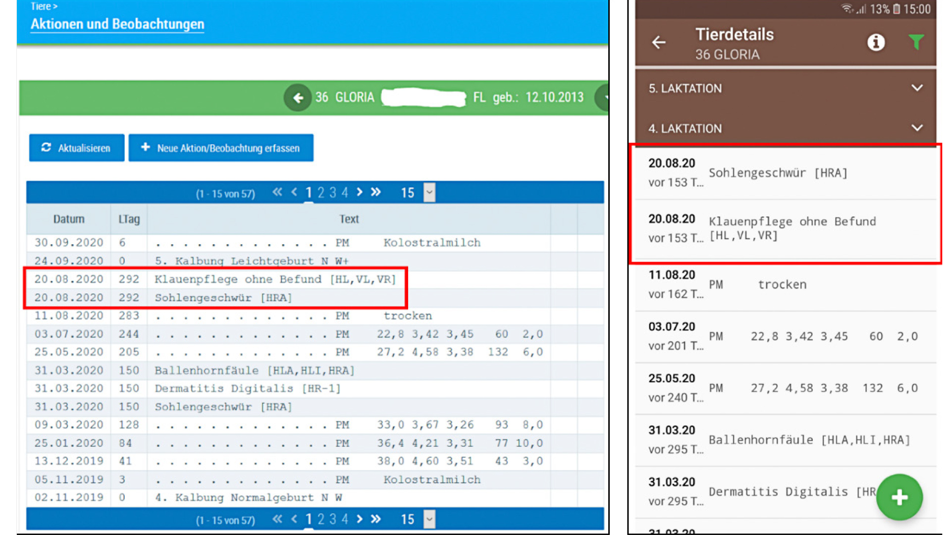 Die Klauenbefunde sind nicht nur zusammengefasst, sondern auch bei jedem klauengepflegten Tier mit allen Details zu finden – im Tierblatt unter „Aktionen und Beobachtungen“ sowie in der RDV-mobil-App unter „Tier-details“.