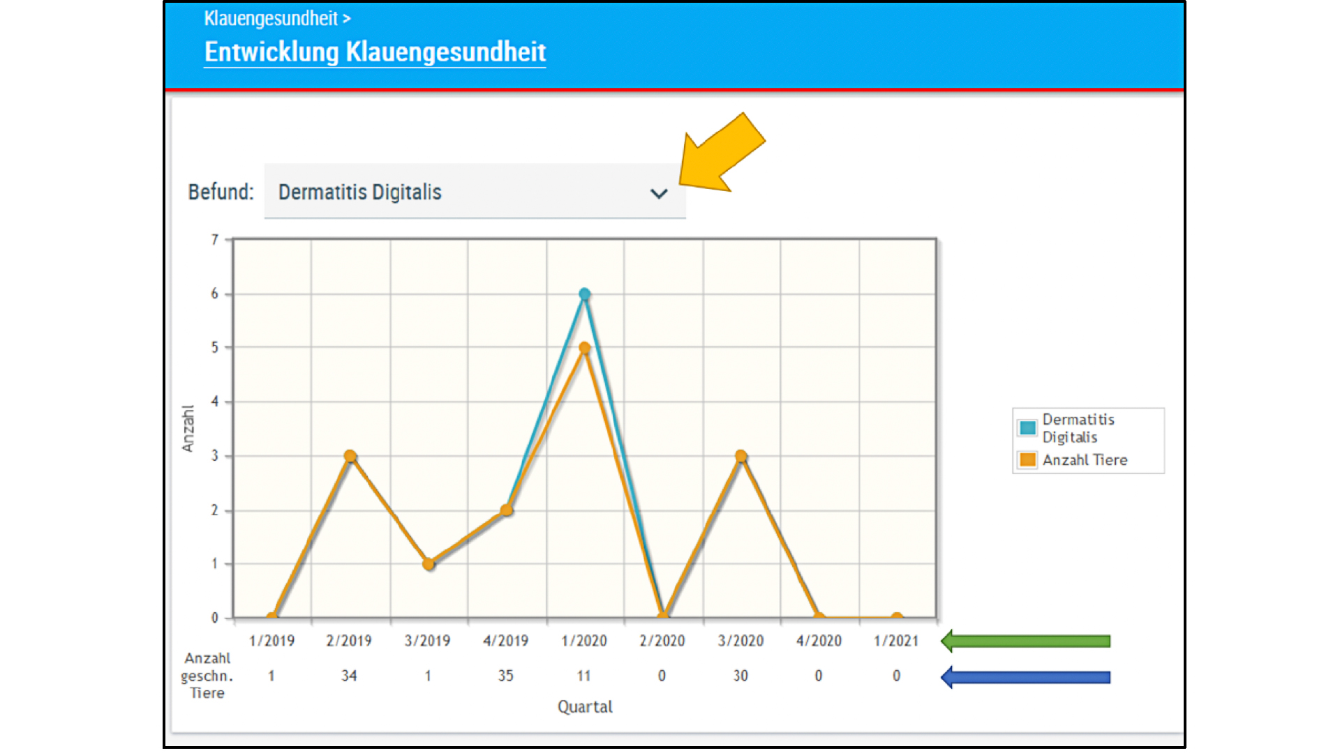 Unter dem Menüpunkt „Entwicklung Klauengesundheit“ kann die Entwicklung einzelner Klauenbefunde im zeitlichen Verlauf (quartalsweise) verfolgt werden (siehe Abb. 3).