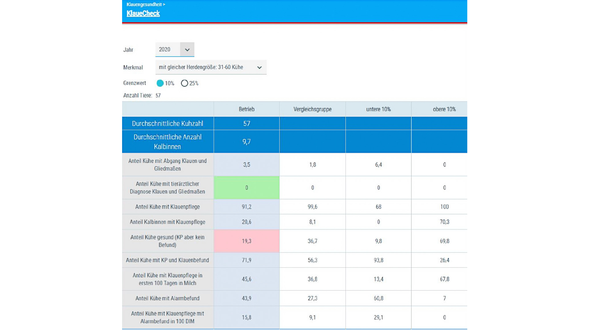 Die Ansicht „KlaueCheck“ (Abb. 4) stellt eine Vielzahl von Kennzahlen zur Klauengesundheit, z. B. die Häufigkeit von Alarm-Klauenbefunden auf Ihrem Betrieb im Vergleich zu anderen Betrieben, dar. Die Kennzahlen beziehen sich dabei immer auf das Kontrolljahr (01. 10. – 30. 09.).