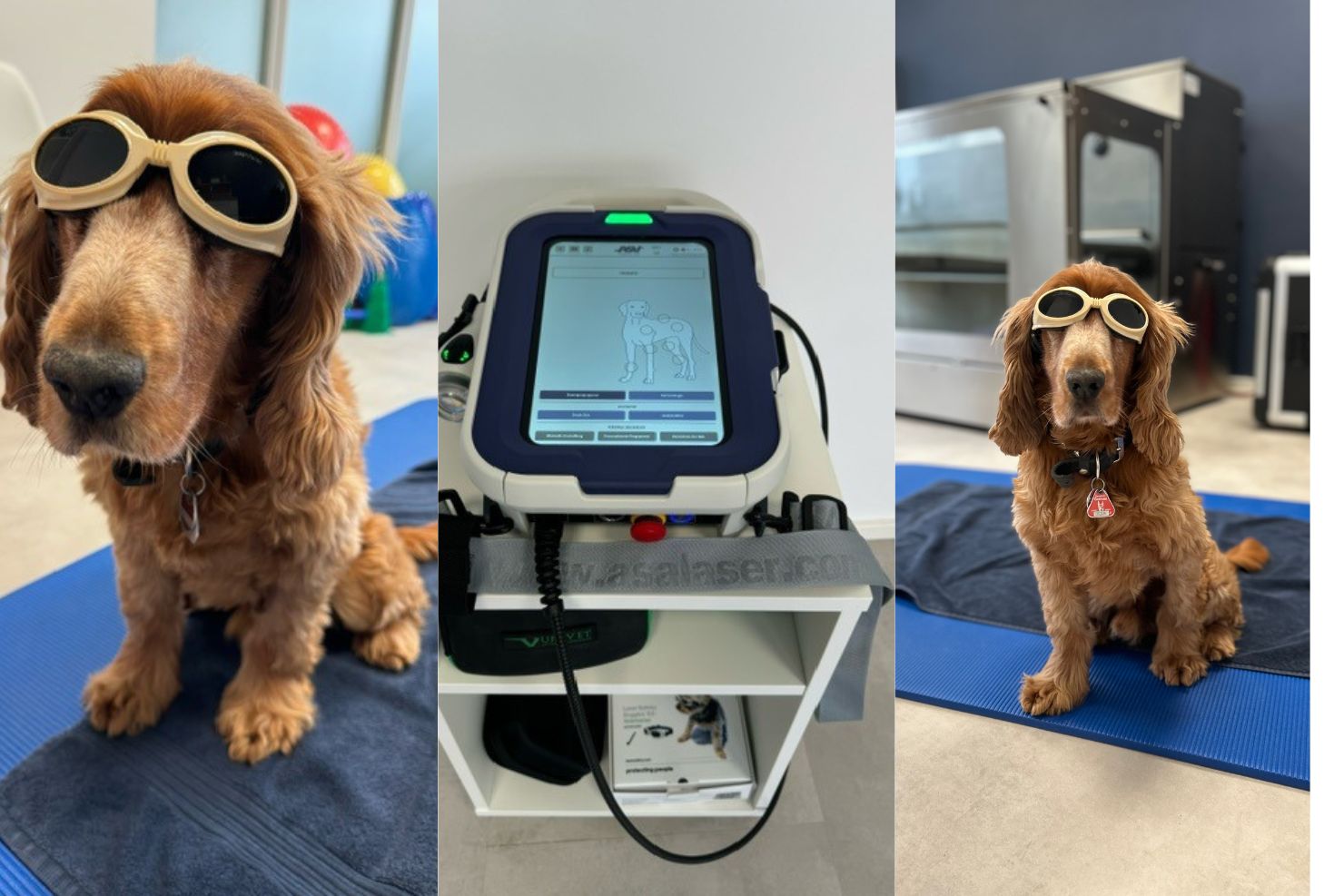 Laser; Hund mit Laserschutzbrille