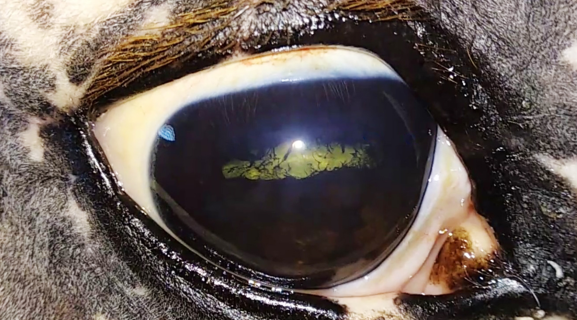 Ich bin der festen Überzeugung, dass jeder Tierarzt / jede Tierärztin und sogar manch ein/e Pferdebesitzer*in Verdacht auf eine beginnende ERU schöpfen und rechtzeitig einen Augenspezialisten hinzuziehen kann – und zwar, noch bevor es zu chronischen, offensichtlichen Veränderungen wie posterioren Synechien, Kataraktbildung, einem Sekundärglaukom oder gar Phthisis bulbi (Schrumpfauge) gekommen ist. Zugegeben: Die Symptome eines akuten ERU-Schubes können teilweise sehr unspezifisch sein (z. B. Epiphora, Bindehautrötung, Photophobie und ggf. Blepharospasmus). Eindeutige Symptome wie eine Miose und entzündliches Exsudat in der vorderen Augenkammer sind mit freiem Auge leider nicht immer erkennbar, und zur Identifikation von Veränderungen im Glaskörper bzw. am Augenhintergrund (Entzündungsprodukte, Netzhautfalten oder Netzhautablösung) ist eine eingehende ophthalmologische Untersuchung unerlässlich. Aber für den Anfangsverdacht reicht eine fokale Lichtquelle und eine verdunkelte Umgebung!