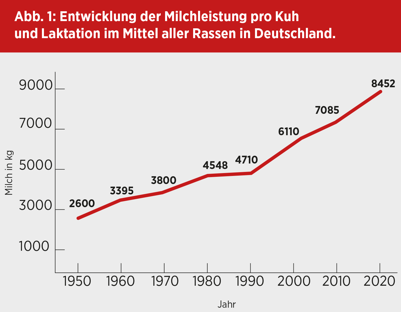 Anlässlich der Veröffentlichung hat nun im März 2022 eine verbändeübergreifende Ad-hoc-Arbeitsgruppe namens „Tierschutz in der Nutztierzucht“ der Bundestierärztekammer in Berlin das Positionspapier „Leistungen der Milchkuh und deren Gesundheitsrisiken“ veröffentlicht. Die Ad-hoc-Arbeitsgruppe setzt sich aus Mitgliedern von DVG, TVD, bpt und der BTK zusammen und führt unter anderem aus, dass die hohe Inzidenz von Erkrankungen ein viel zu frühes Ausscheiden aus der Produktion und damit eine viel zu kurze Nutzungsdauer mit erhöhter Todesfallrate verursache. Natürlich spiele dabei das Farmmanagement eine große Rolle, was zweifelsohne zu einer breiten Streuung gesunder und kranker Tiere führe. Dabei sind in erster Linie nicht nur die ökonomischen Verluste ausschlaggebend, sondern es liege ein grundsätzliches Tierschutzproblem vor. Sehr deutlich verweist die BTK-Arbeitsgruppe auch auf das deutsche Tierschutzgesetz (§ 3, Nr. 1), laut dem es „verboten ist, einem Tier Leistungen abzuverlangen, denen es wegen seines Zustands nicht gewachsen ist bzw. die seine Kräfte übersteigen“. Gerade aufgrund der immens gestiegenen Milchleistungen der letzten 30 Jahre (s. Abb. 1) wird die Problematik immer deutlicher (besonders ausgeprägt bei HF-Kühen). Die hohe Inzidenz der sogenannten Produktionskrankheiten – postpartal mit Anstieg der Milchleistung und der immensen Steigerung des Stoffwechsels – führt in der Regel unweigerlich aufgrund der Priorität der Milchleistung zu Tiergesundheitsstörungen.