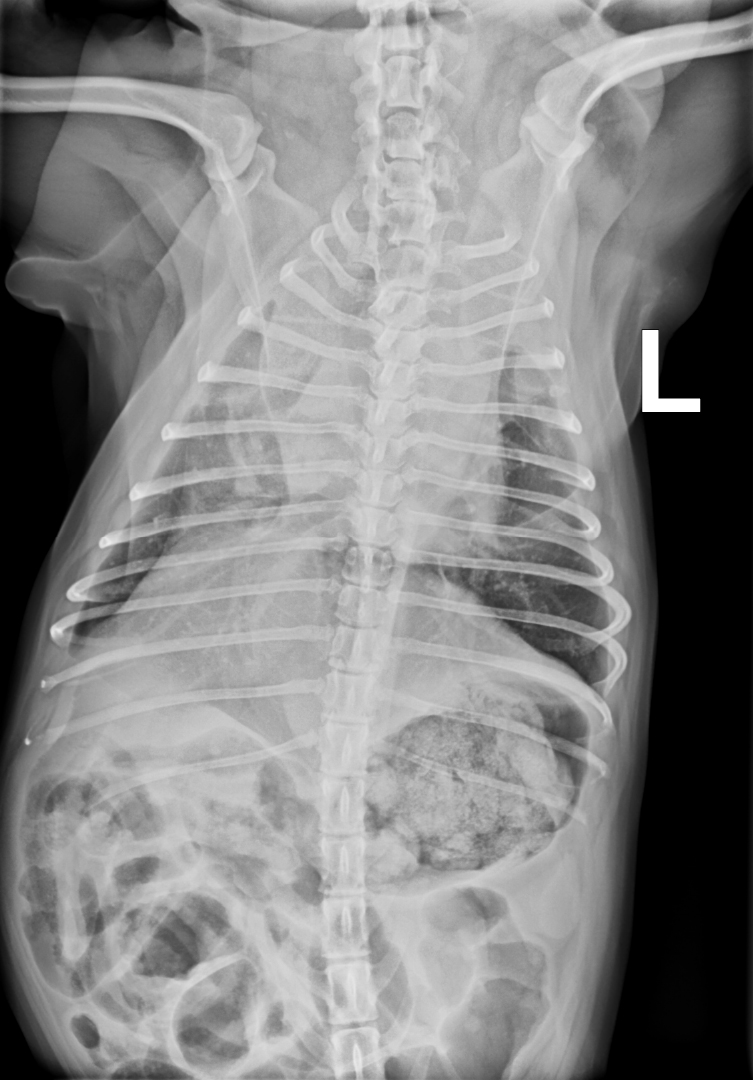 Der Versuch, Cherry für ein Thoraxröntgen auf die Seite zu legen, führte zu Dyspnoe und hochgradiger Zyanose. Eine Gabe von Butorphanol (0,2 mg/kg i.m.) und das Verbringen von Cherry in eine Sauerstoffbox für ca. 30 Minuten ermöglichten eine stressreduzierte Röntgenaufnahme und eine Blutentnahme. Die Untersuchung des Differentialblutbilds sowie der Blutchemie inklusive Elektrolyte wies keine Abweichung von der Norm auf. Die laterolaterale Röntgenaufnahme des Thorax (Abb. 1) zeigte eine verminderte Abgrenzbarkeit der Herzsilhouette. Im Bereich der Herzbasis stellte sich eine interstitielle Lungenzeichnung dar. Auf der Röntgenaufnahme im ventro-dorsalen Strahlengang war präkardial, sowie im Bereich des rechten cranialen Lungenlappens eine deutliche weichteildichte Verschattung erkennbar (Abb. 2).