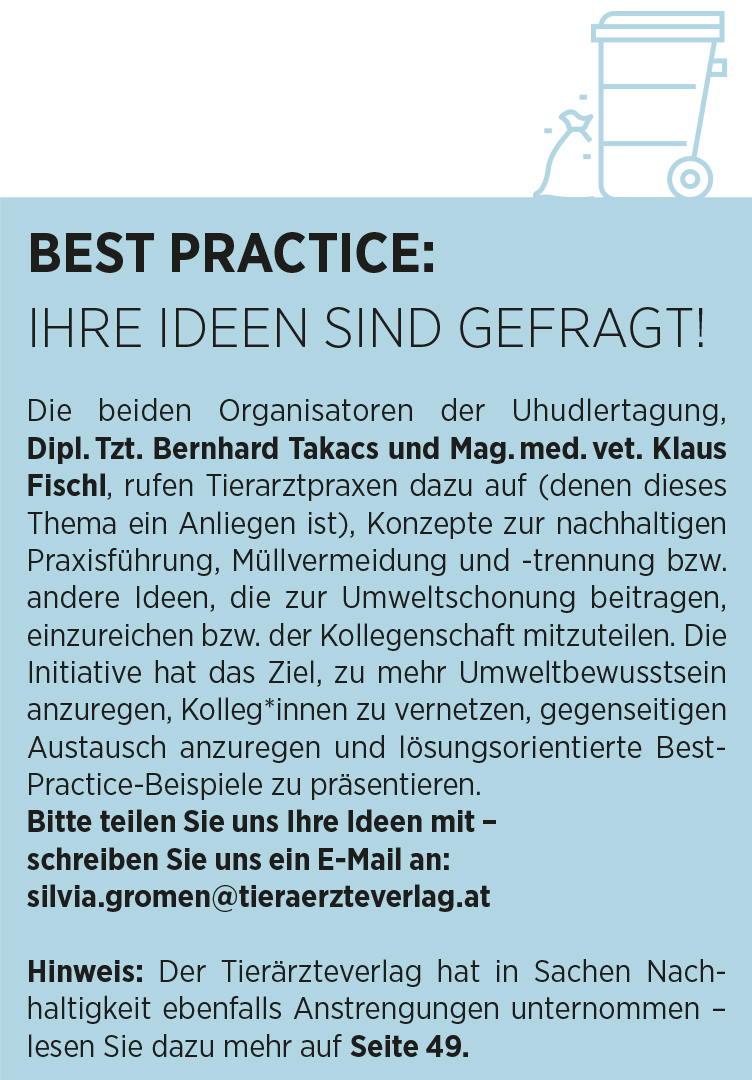 Angesichts der Berge an Müll, die eine Tierarztpraxis täglich produziert, scheint das Konzept einer nachhaltigen Ordination kaum umsetzbar. Doch nicht nur E-Autos und Photovoltaikanlagen, auch kleine Änderungen im täglichen Ablauf können viel bewirken. Wie das klappt, erklärt der praktische Tierarzt Dirk Schölch.