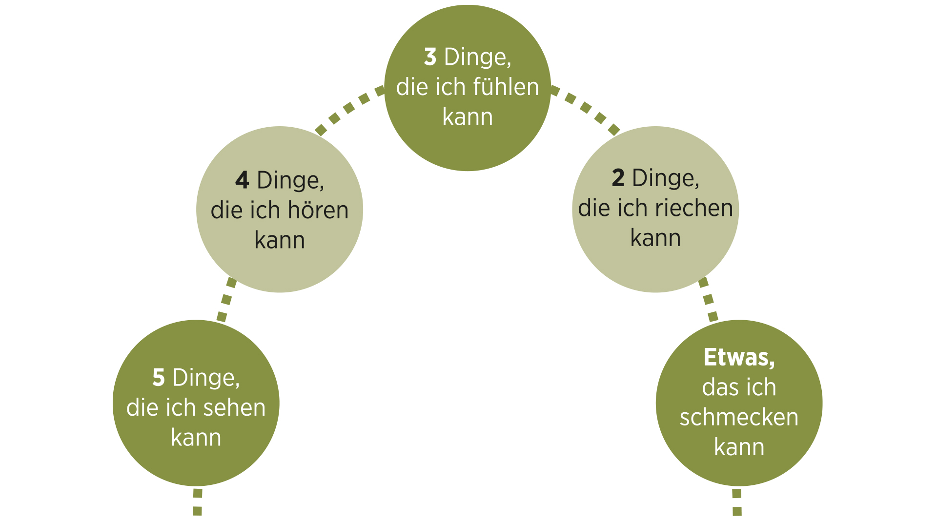 Versuchen Sie durch die folgende 5-4-3-2-1-Übung, Ihre Sinne im Alltag zu schärfen und angenehme Empfindungen in Zukunft bewusster wahrzunehmen. Bleiben Sie dafür bei sich und konzentrieren Sie sich auf die Gegenwart:
